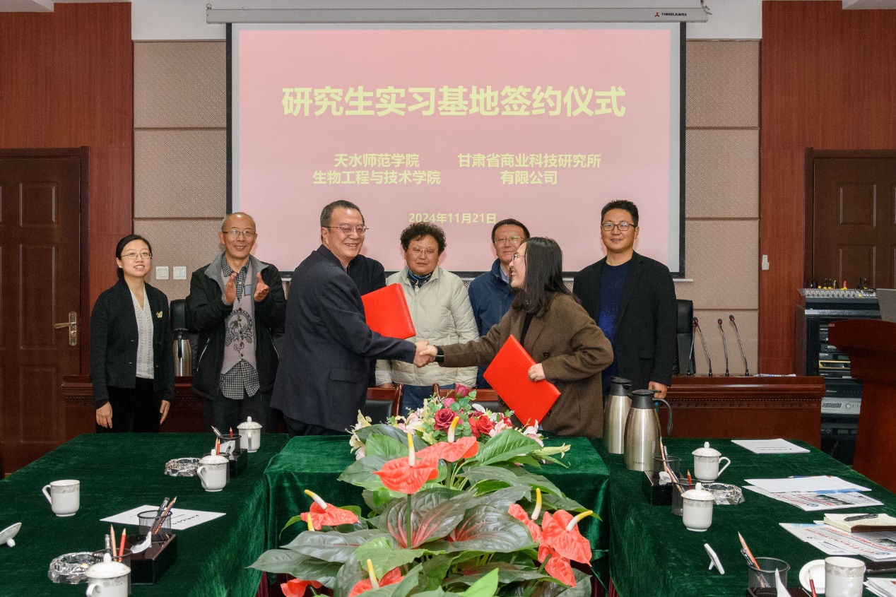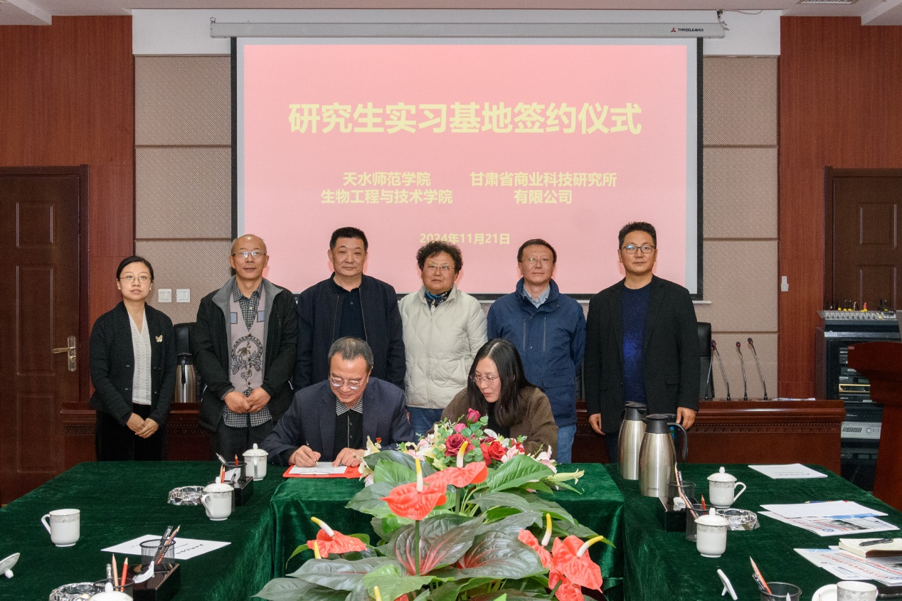 2024年11月22日,天水师范学院Beat365中文官方网站刘艳梅副院长、赵菲轶教授、袁毅君教授、郭志刚研究员和曹铭老师一行5人,赴甘肃省商业科技研究所有限公司、兰州百灵生物有限公司签订生物与医药研究生实习基地相关协议。