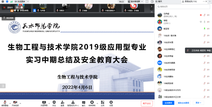 为进一步贯彻落实习近平总书记关于安全生产的重要论述及学校党委关于疫情防控工作的安排部署要求,及时发现和总结实习过程中的问题,在与实习单位前期沟通和反馈的基础上,Beat365中文官方网站于4月6日召开2019级应用型专业实习中期总结及安全教育大会。党总支副书记石国玺,副院长马伟超,特邀嘉宾复旦大学杨亚军教授,全体实习指导教师,2019级生物技术、生物制药、食品质量与安全三个应用型专业全体同学,共计156人参加了会议。
