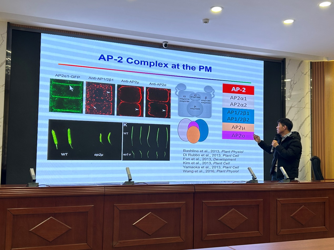 青年教师王玉同博士呈现了题为《拟南芥网格蛋白及其接头蛋白AP-1介导胞吐途径的研究》的报告。王玉同博士详细介绍了网格蛋白及其接头蛋白AP-1在介导胞吐途径中的分子机制、结构功能关联以及动态调控网络,其前沿的研究成果与创新的研究思路为理解植物细胞生长发育、信号转导及逆境响应过程中的物质运输调控提供了全新的视角。