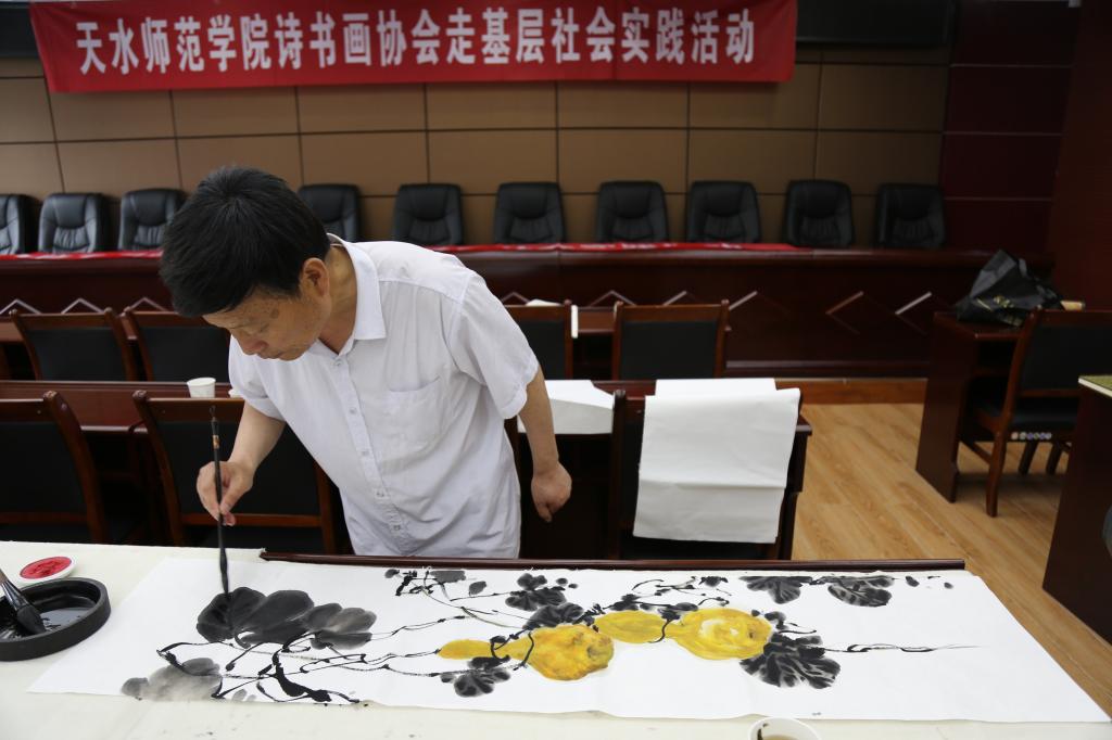 考察期间,学院邀请的天水市书画协会艺术家们现场泼墨,为林场职工赠送了精美的书法和绘画作品,受到林场职工的热烈欢迎。